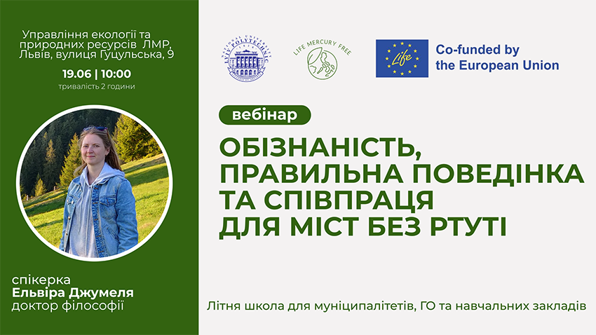 У рамках міжнародного проєкту Complex Awareness Raising and Behaviour Change for the Mercury-Free City Environment (LIFE Mercury-FREE), спрямованого на зменшення забруднення довкілля ртуттю задля екологічної безпеки, відбудеться другий офлайн-вебінар Літньої школи «Обізнаність, правильна поведінка та співпраця – для міст без ртуті». Захід розпочнеться о 10:00 19 червня 2025 року у приміщенні управління екології та природних ресурсів Львівської міської ради (м. Львів, вул. Гуцульська, 9) і триватиме 2 години.